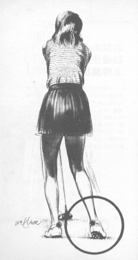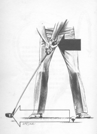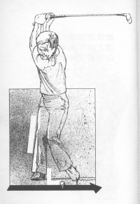 如果你的揮桿過於鬆散,則上桿時大部份的重心都會移到右腳的外側,而在下桿時就會產生過多的肩部動作。為了使揮桿動作緊湊,並使上桿產生正確的盤旋之勢,瞄球時右腳要與目標線垂直,右膝也要向內彎曲。這會教你倚著重心所在的身體右側上桿,並且保持右膝彎曲。在揮桿頂點設下如此的壓力之後,你的雙腳在下桿時自然會做出反應,進而減少過多的肩部動作。 Top