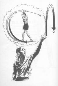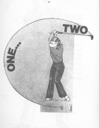 為了改進她對揮桿時間的控制,我要求她在上桿時數「一,….」,然後刻意在上桿頂點停頓一下,接著在下桿之前從容地數「二」。這會使她的上桿速度放慢,而且會加大上桿的幅度,身體重心的轉換也會更加正確,而使得球飛的更遠。如果你在上桿時也能數到二,這個方法對你也會有用的。
