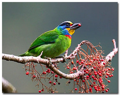 全長約 20 公分 ,是雜木林中常見鳥類,人稱「花和尚」,但並非指花花和尚,而是口喧木魚聲、身披五彩袈裟。翠綠身影隱在枝葉間時,具有極佳的保護色,不過牠的鳴聲宏亮而獨特,倒也不難循聲找至今蹤影。